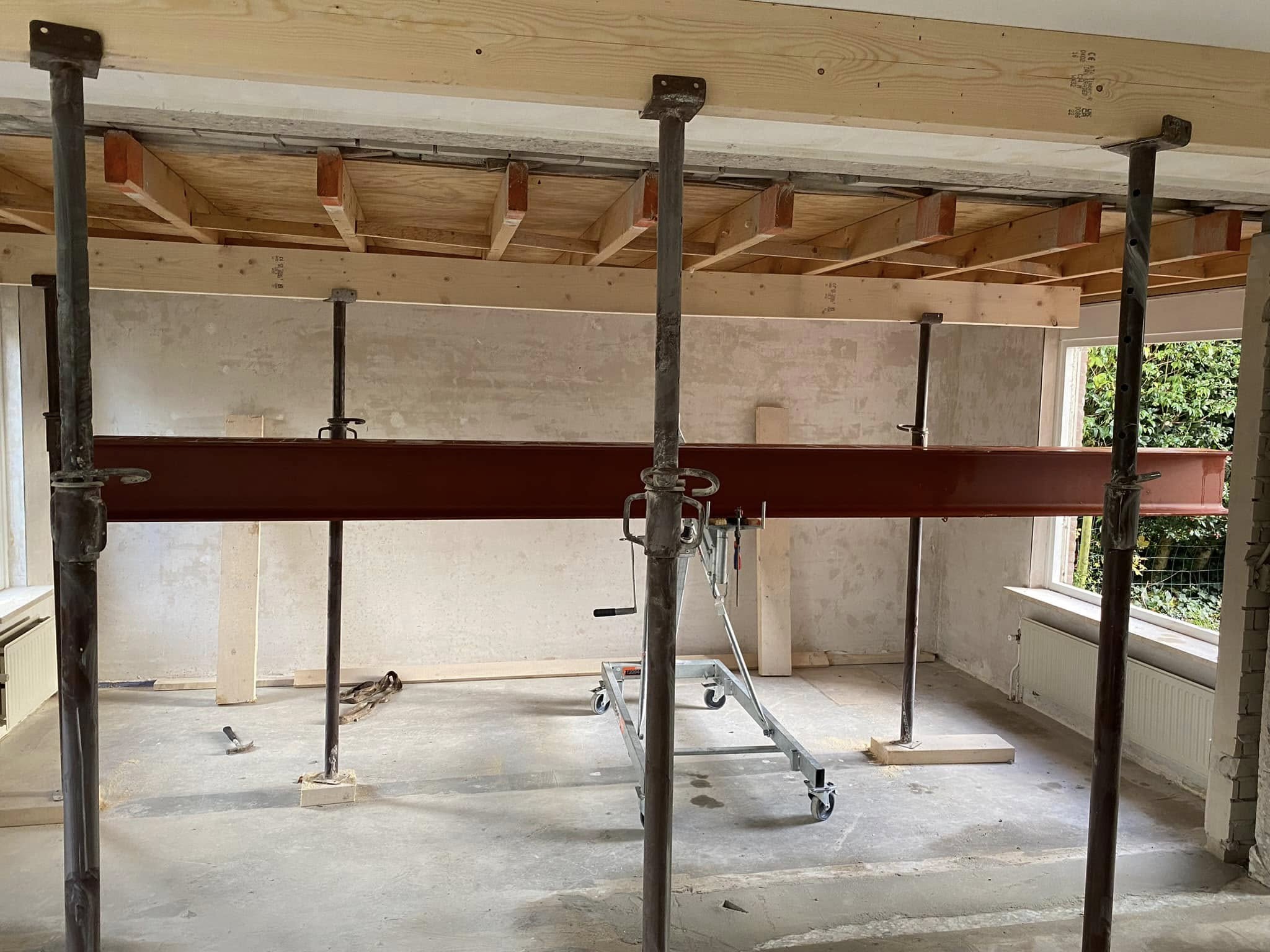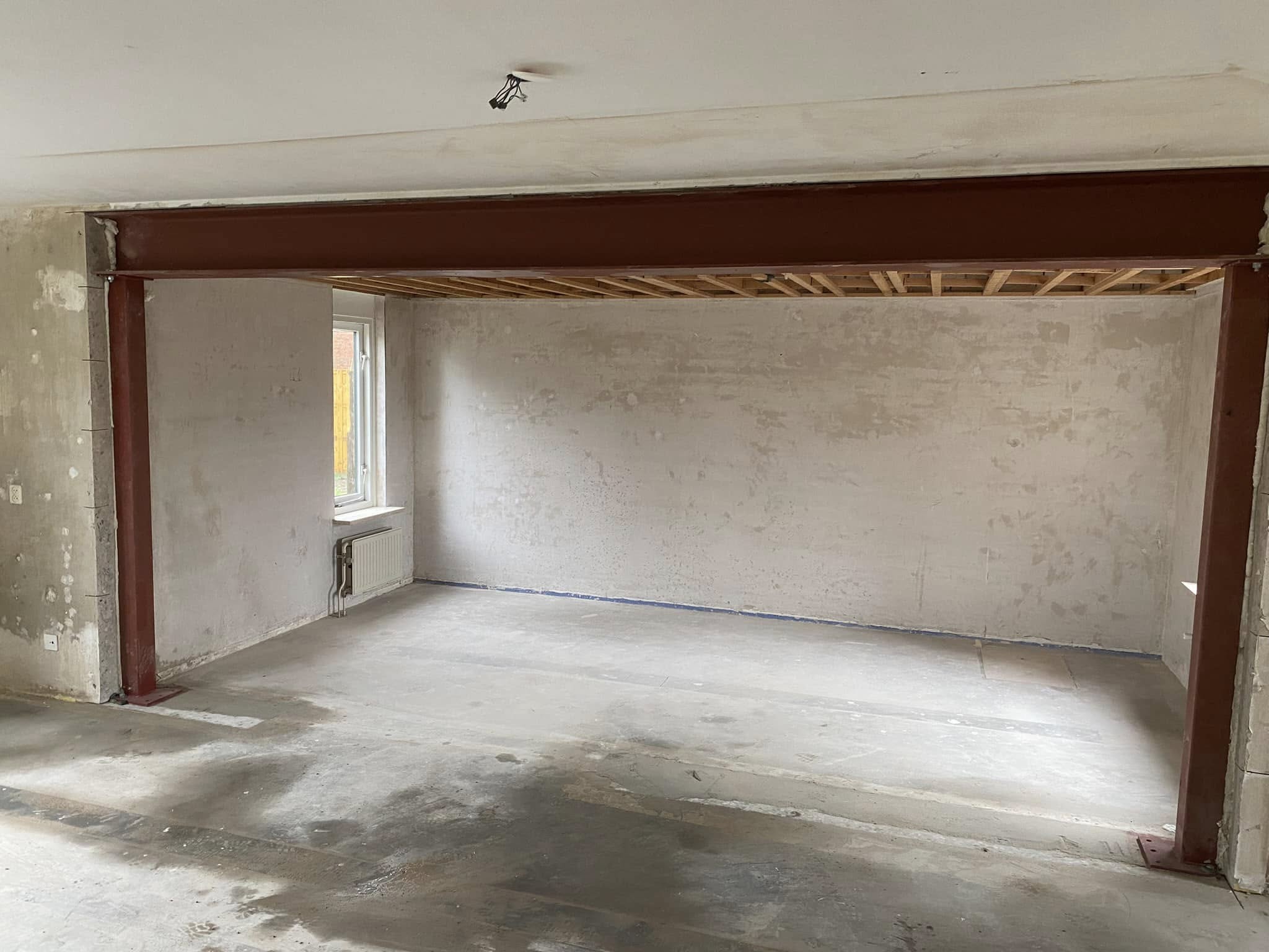 De ingreep werd uitgevoerd met een zware stalen balk, die met een verreiker op z’n plek is gebracht. Alles gebeurde volgens de berekeningen van de constructeur, zodat veiligheid en stabiliteit gegarandeerd zijn. Het eindresultaat is een moderne en ruime leefruimte waar de bewoners nog jarenlang van kunnen genieten.